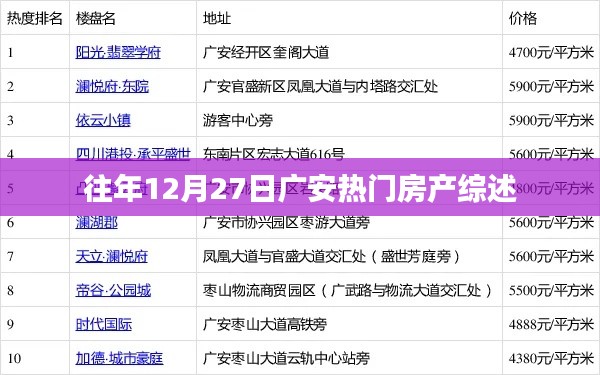每年的12月27日,广安市的房地产市场都会迎来一波热潮,这一天,各大房地产商纷纷推出新盘、优惠活动,吸引众多购房者关注,本文旨在回顾往年12月27日广安热门房产的情况,为购房者提供有价值的参考信息。