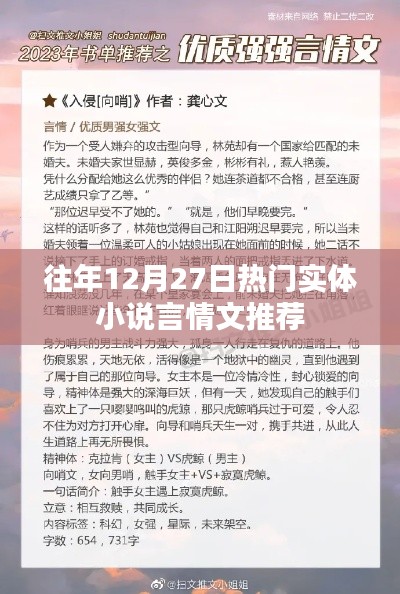这些往年12月27日热门的实体小说言情文都是值得一读的佳作,它们以其优美的文笔、深刻的情感和丰富的情节,吸引着广大读者,如果你喜欢阅读言情文,那么这些小说一定是你的不二之选。