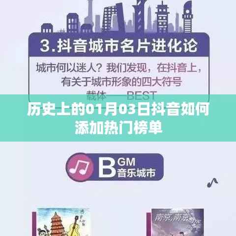 本文介绍了历史上的01月03日抖音平台如何添加热门榜单,并探讨了其背后的原因和影响,热门榜单作为衡量内容受欢迎程度的重要指标之一,为用户提供了更加丰富的选择,要成功添加抖音热门榜单,需要注意优质内容、精准定位、高互动度和把握时机等方面,热门榜单的推出对平台和用户都产生了积极的影响,推动了抖音内容生态的发展。