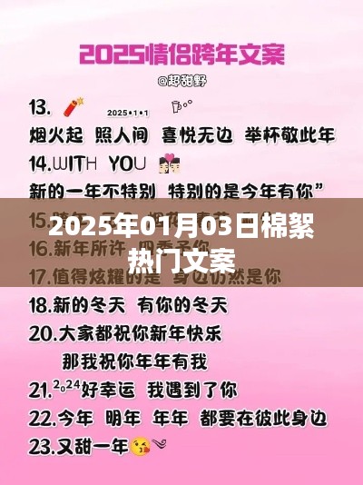 棉絮作为一种重要的生活用品和文化遗产,在我们的生活中扮演着重要的角色,在2025年1月3日这个特殊的日子,让我们共同关注棉絮的热门文案,感受棉絮的魅力,愿我们在新的一年里,如同棉絮般纯净、温暖、关爱他人,共创美好未来。