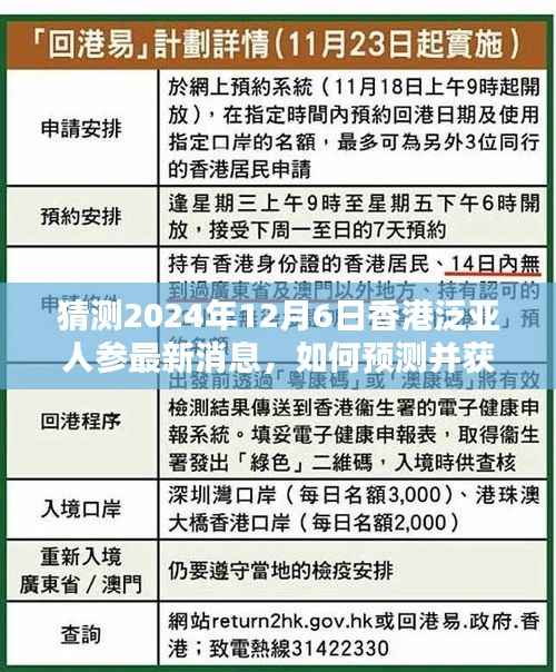 随着信息时代的发展,获取最新消息已成为日常生活中不可或缺的技能,本指南旨在帮助读者了解如何预测并获取关于香港泛亚人参的最新消息,尤其针对2024年12月6日的信息进行猜测和追踪,无论您是初学者还是有一定基础的进阶用户,请跟随我们的步骤,掌握这一技能。
