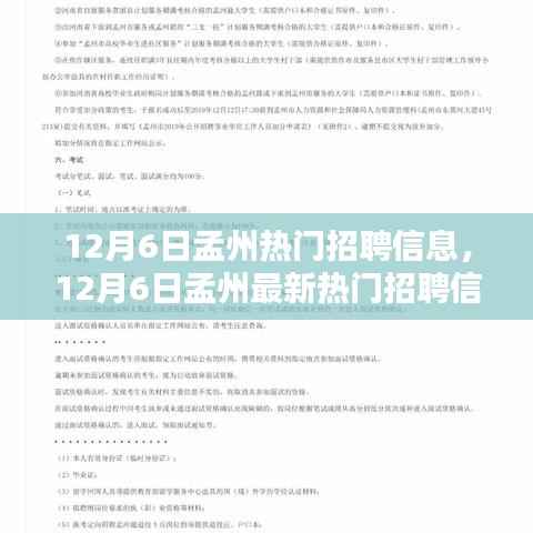 随着冬季的来临,12月的孟州人才市场也迎来了新的活跃期,对于求职者而言,掌握最新的招聘信息是顺利求职的关键,本文将为您梳理并呈现孟州地区在12月6日的热门招聘信息,助您轻松找到心仪的工作机会,让我们一起了解这些招聘信息背后的故事,为您的职业生涯添砖加瓦。