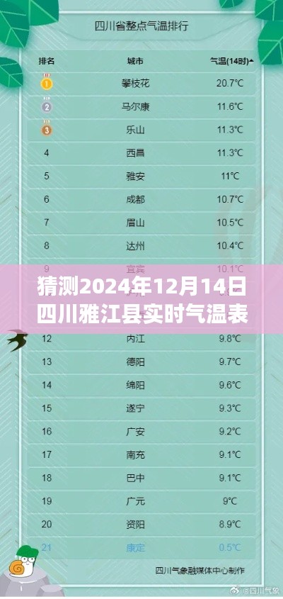 让我们来猜猜看,2024年12月14日,四川雅江县的气温会是怎样的呢?是温暖的阳光照耀着大地,还是带着一丝寒冷的冬风?无论结果如何,这场探索之旅都将充满惊喜和乐趣。